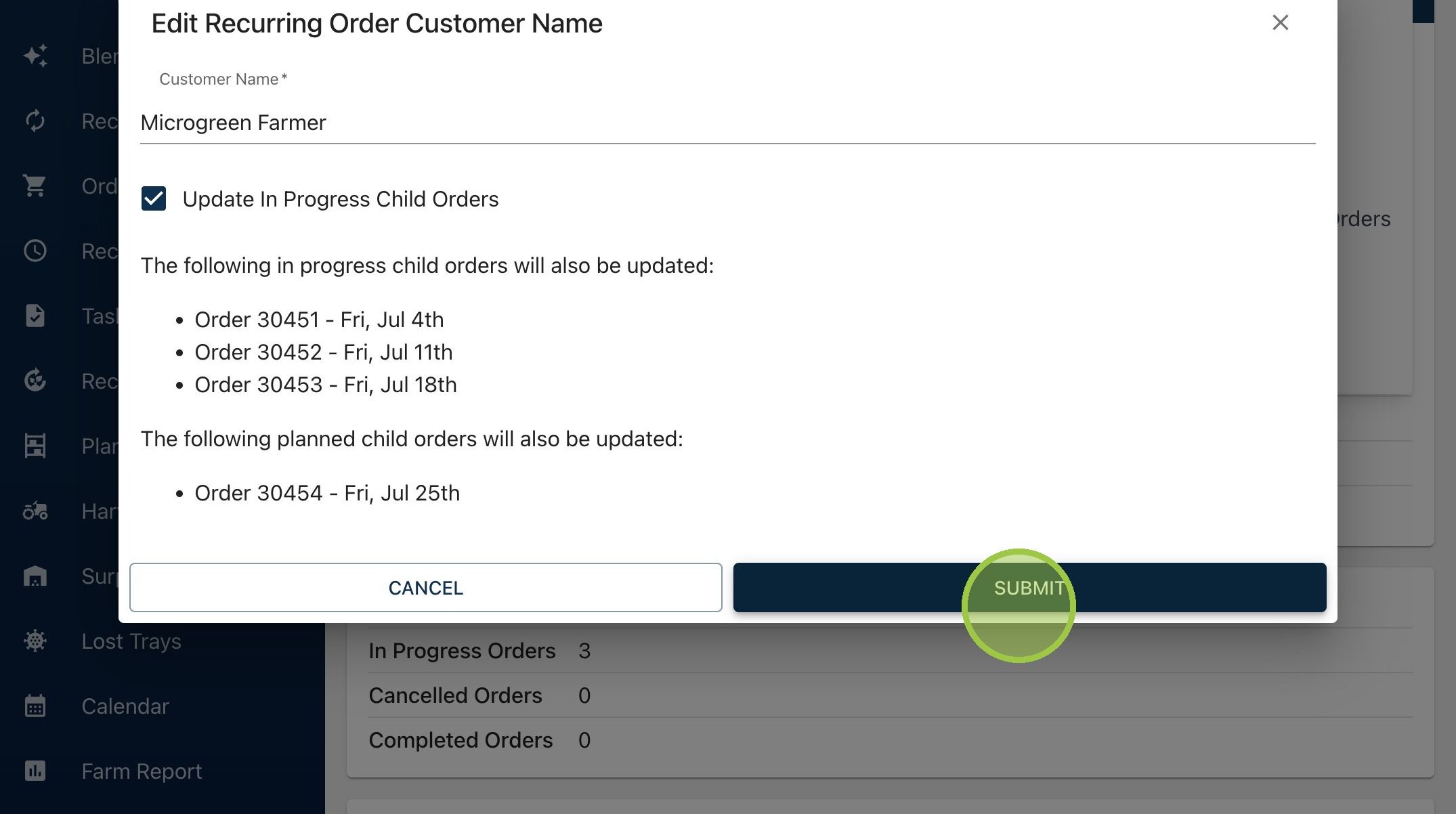 2. A form will appear where you can change the customer's name. Select "Update In Progress Child Orders" to push the new name on existing "In Progress" orders