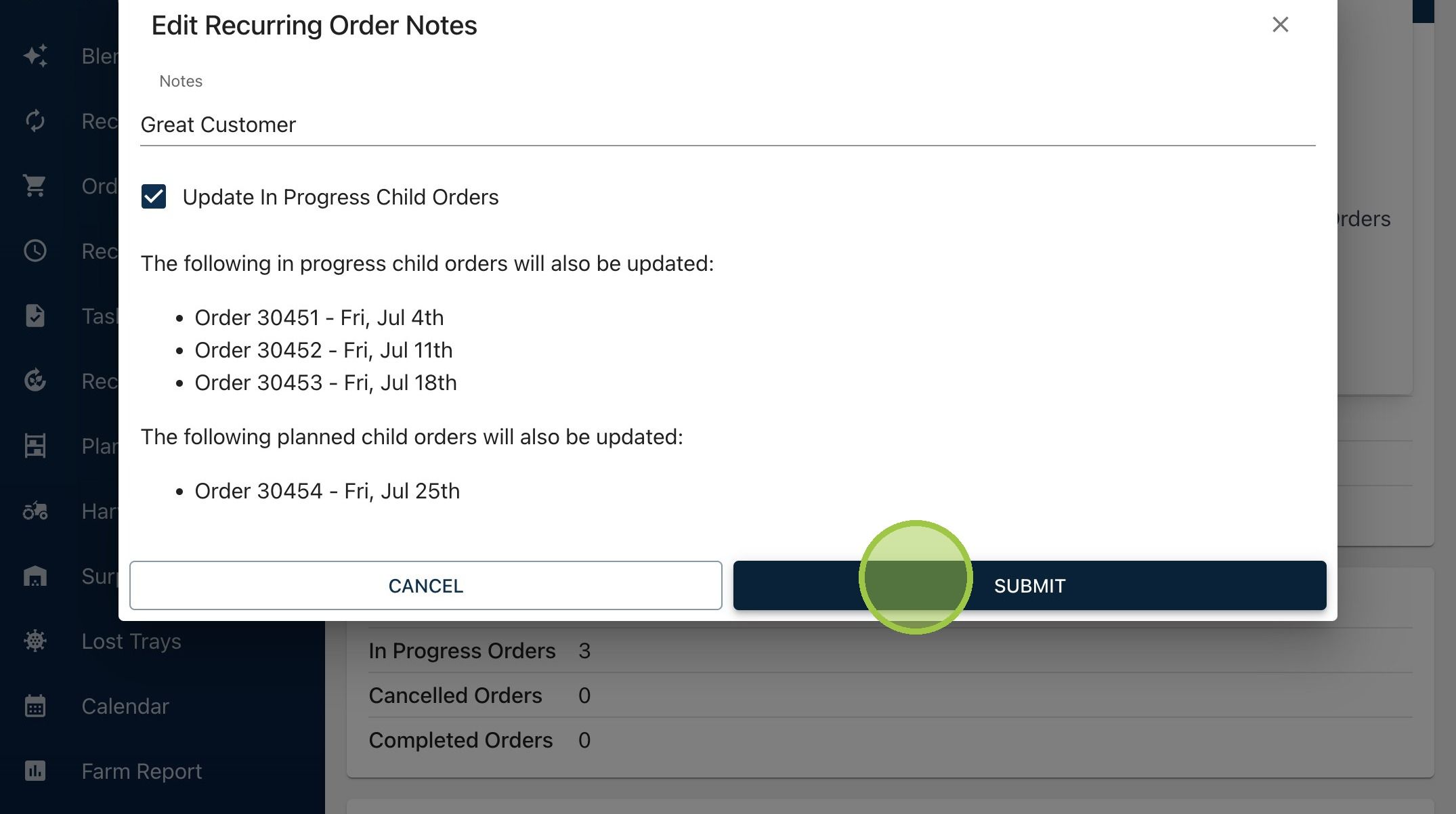 5. A similar form will appear. Adjust the notes, then decide if you want the update to impact in progress orders. Click "Submit"