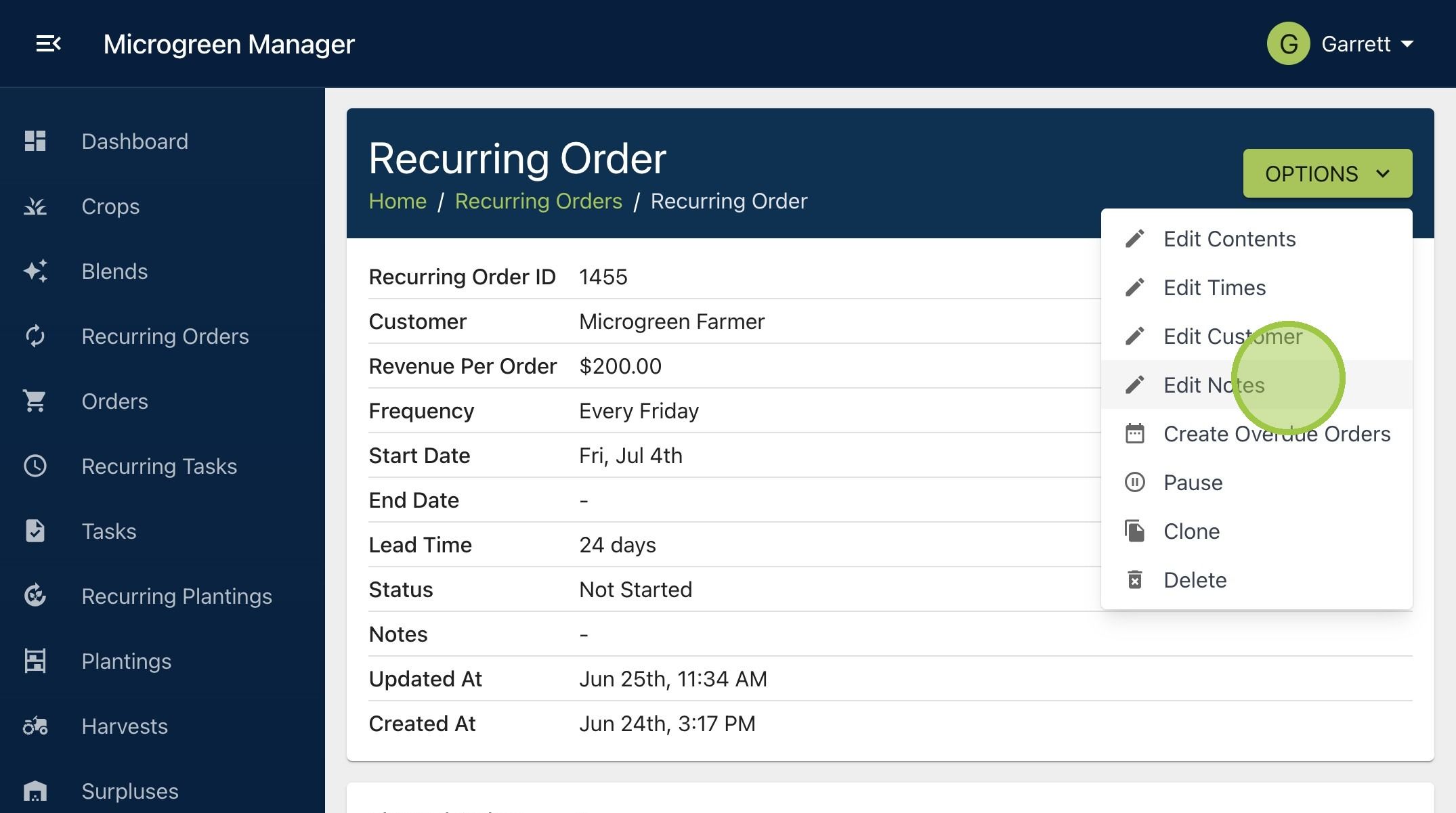 4. To edit the notes for your recurring order, click "Options" then "Edit Notes"
